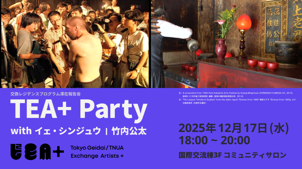 東京藝術大学大学院 国際芸術創造研究科では国立台北芸術大学と協働して交換レジデンスプログラム「TEA+」を実施しています。イェ・シンジュウは個人の映像制作が普及し始めた1990年代の日本における映像ドキュメントの実践について、竹内公太は日本の占領期における抗日運動と関係する台湾の宗教施設や記念碑について調査をおこないました。それぞれのアーティスト、キュレーターの関心や活動について、また今回の滞在中の活動を今後どのように将来展開していくのかについてお話しいただきます。どなたでも参加可能ですので、ぜひお気軽にお越しください。