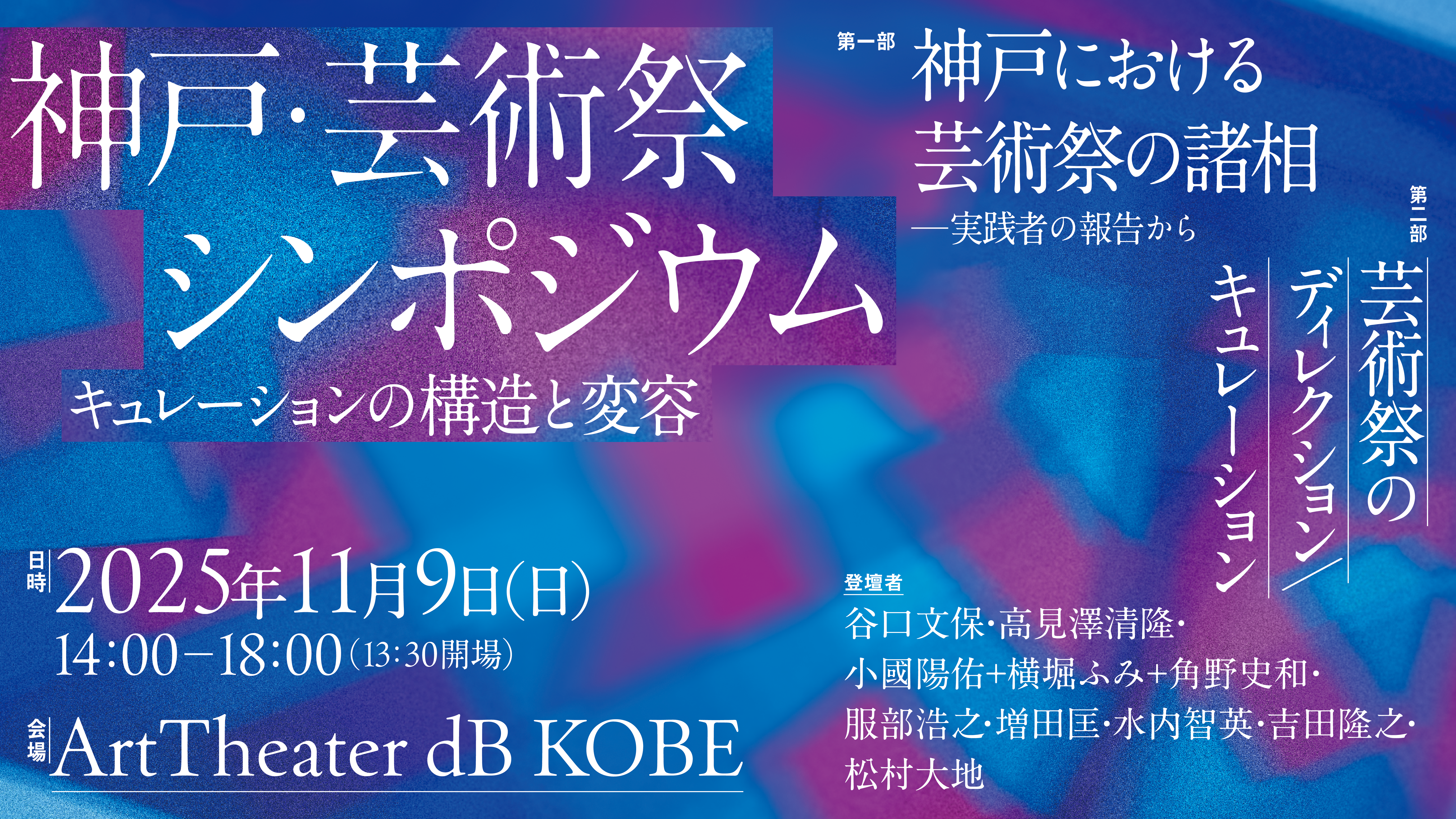 Kobe-Art festivals Symposium ―Structural Transformation of Curation We are pleased to announce the “Kobe-Art Festivals Symposium: The Structure and Transformation of Curation,” to be held in Kobe City on Sunday, November 9, 2025.   Art festivals, characterized by their periodic occurrence every few years in specific regions, continue to increase in number even as of 2025. Art projects tied to cities have often engaged in reimagining places through collaboration with others, seeking to uncover their new value. This could be described as a relational turn in the understanding of place. However, it is no longer solely the works or artists…