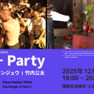 国際芸術創造研究科と国立台北芸術大学が協働する交換レジデンスプログラム「TEA+」の参加者イェ・シンジュウ(モモコ)と竹内公太が今回の滞在中の活動を振り返る報告会を行います。